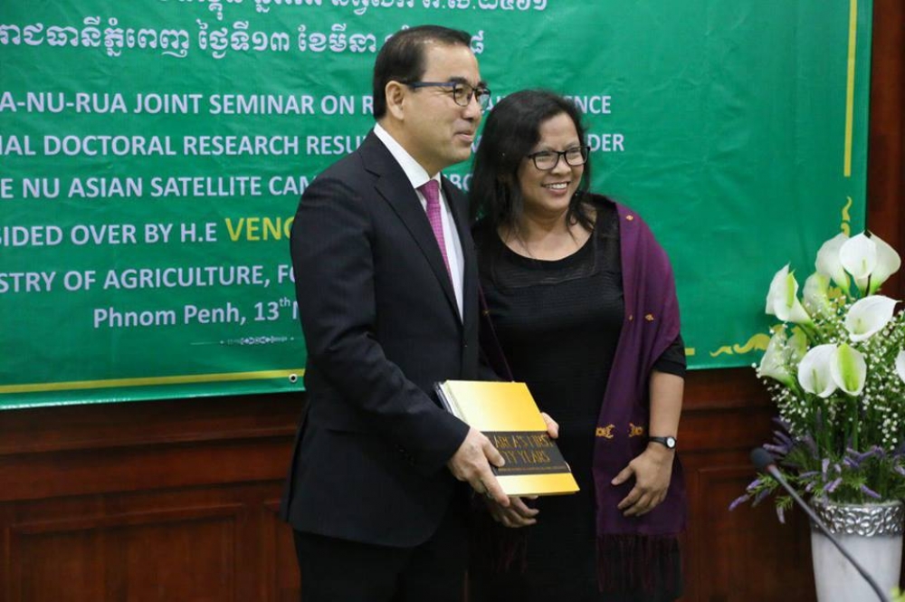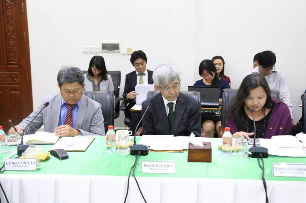 ក្នុងឱកាសនេះសាស្រ្តាចារ្យ Fumio Isoda សាកលវិទ្យាធិការ សកលវិទ្យាល័យ Nagoya បានរាយការណ៍ជូនជ្រាបដោយសង្ខេបពីលទ្ធផលនៃកិច្ចសហប្រតិបត្តិការលើការបណ្តុះបណ្តាលនិងអភិវឌ្ឍធន ធានមនុស្សសម្រាប់វិស័យកសិកម្មនារយៈពេលកន្លងមក។ នាឱកាសនេះឯកឧត្តមរដ្ឋមន្រ្តី បានផ្លែងអំណរគុណជូនចំពោះស្ថានទូតជប៉ុន អង្គការ JICA អង្គការ SEARCA និងជាពិសេស Nagoya University ដែលបានជួយគាំទ្រអស់ពីកំលាំងកាយចិត្តទាំងសម្ភារ ថវិកា និងធនធានសាស្រ្តាចារ្យដើម្បីបង្កើតនិងបន្តជំរុញឲ្យសាកលវិទ្យាល័យមួយនេះមានដំណើរការល្អតាំងពីពេលចាប់ផ្តើមរហូតមកទល់បច្ចុប្បន្ន ជាសក្ខីភាព ថ្ងៃនេះមាននិស្សិតថ្នាក់បណ្ឌិតចំនួន០២ រូប គឺបណ្ឌិតងិន ឆាយ និងបណ្ឌិតប៉ុន ចាន់ នឹងធ្វើបទបង្ហាញពីលទ្ធផលនៃការស្រាវជ្រាវវិទ្យាសាស្រ្តអំពីដំណាំស្រូវនិងគោទឹកដោះ។ នេះគឺជាធនធានមនុស្សដែលពោរពេញដោយចំណេះដឹងនិងបទពិសោធន៍សម្រាប់កសាងនិងអភិវឌ្ឍវិស័យកសិកម្មសមស្របតាមគោនយោបាយរបស់រាជរដ្ឋាភិបាលស្តីពីការអភិវឌ្ឍធនធានមនុស្សដែលជាគ្រឹះមួយយ៉ាងសំខាន់មិនអាចខ្វះបានក្នុងការអភិវឌ្ឍប្រទេសជាតិទាំងក្នុងពេលបច្ចុប្បន្ននិងអនាគត។ តាមការសិក្សាស្រាវជ្រាវរបស់ក្រសួងបានបង្ហាញថា កំលាំងពលកម្មក្នុងវិស័យកសិកម្មមានការធ្លាក់ចុះជាបន្តបន្ទាប់ ដូច្នេះការបណ្តុះបណ្តាលធនធានមនុស្សដែលពោរពេញដោយសមត្ថភាព ព្រមជាមួយនិងការប្រើប្រាស់បច្ចេកវិទ្យាទំនើបៗ គឺសមស្របទៅនឹងវិបត្តិនៃកង្វះខាតពលកម្មកសិកម្ម ព្រមជាមួយនិងគោលនោបាយរបស់ក្រសួងក្នុងការជំរុញការធ្វើទំនើបកម្មកសិកម្មដើម្បីបង្កើនទិន្នផល និងបង្កើនផលិតភាពផលិតកម្មសំដៅដល់ការកាត់បន្ថយថ្លៃដើមផលិត កាត់បន្ថយកំលាំងពលកម្ម ធានាបានទាំងបរិមាណនិងគុណភាព សនិ្តសុខស្បៀងនិងអាហារូបត្ថម្ភ។