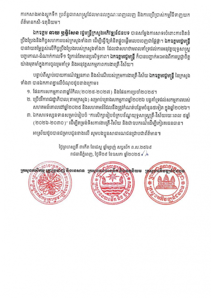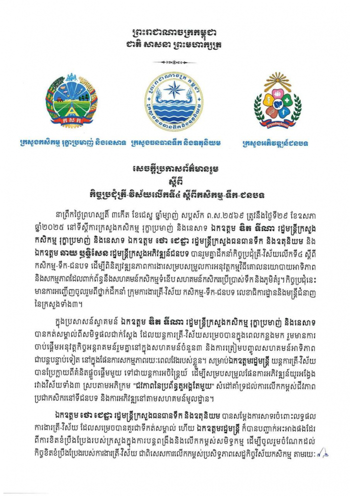 សេចក្ដីប្រកាសព័ត៌មានរួមស្ដីពី «កិច្ចប្រជុំត្រី-វិស័យលើកទី៤ស្ដីពីកសិកម្ម-ទឹក-ជនបទ» នាព្រឹកថ្ងៃព្រហស្បតិ៍ ទី២៩ ខែឧសភា ឆ្នាំ២០២៥ នៅទីស្ដីការក្រសួងកសិកម្ម រុក្ខាប្រមាញ់ និងនេសាទ៕