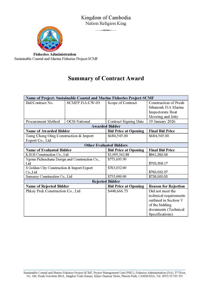 រដ្ឋបាលជលផលបានទទួលហិរញ្ញប្បទានពីធនាគារអភិវឌ្ឍន៍អាស៊ី (ADB) និងទីភ្នាក់ងារបារាំងសម្រាប់ការអភិវឌ្ឍ (AfD) សម្រាប់គម្រោងជលផលសមុទ្រ និងតំបន់ឆ្នេរប្រកបដោយចីរភាព (Sustainable Coastal and Marine Fisheries - SCMF) សូមជូនដំណឹងសង្ខេបពីការវាយតម្លៃ និងប្រគល់កិច្ចសន្យាសាងសង់ផែនាវាល្បាតរបស់អធិការកិច្ចជលផលសមុទ្រ (Construction of Preah Sihanouk FiA Marine Inspectorate Boat Mooring and Jetty) SCMFP FIA/CW-03នៅខេត្តព្រះសីហនុ។