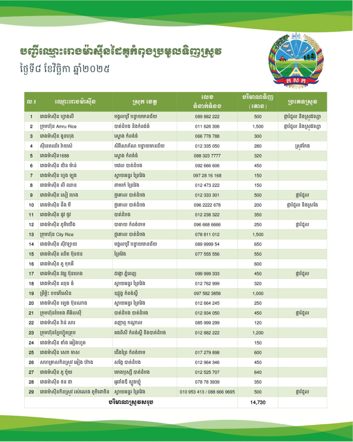 ថ្ងៃនេះរោងម៉ាស៊ីនដៃគូរបស់ក្រសួងកសិកម្មបានបន្តប្រមូលទិញស្រូវជិត១៥០០០តោនបន្ថែមទៀត ពីពុកម៉ែបងប្អូនប្រជាកសិករនៅទូទាំងប្រទេស។
