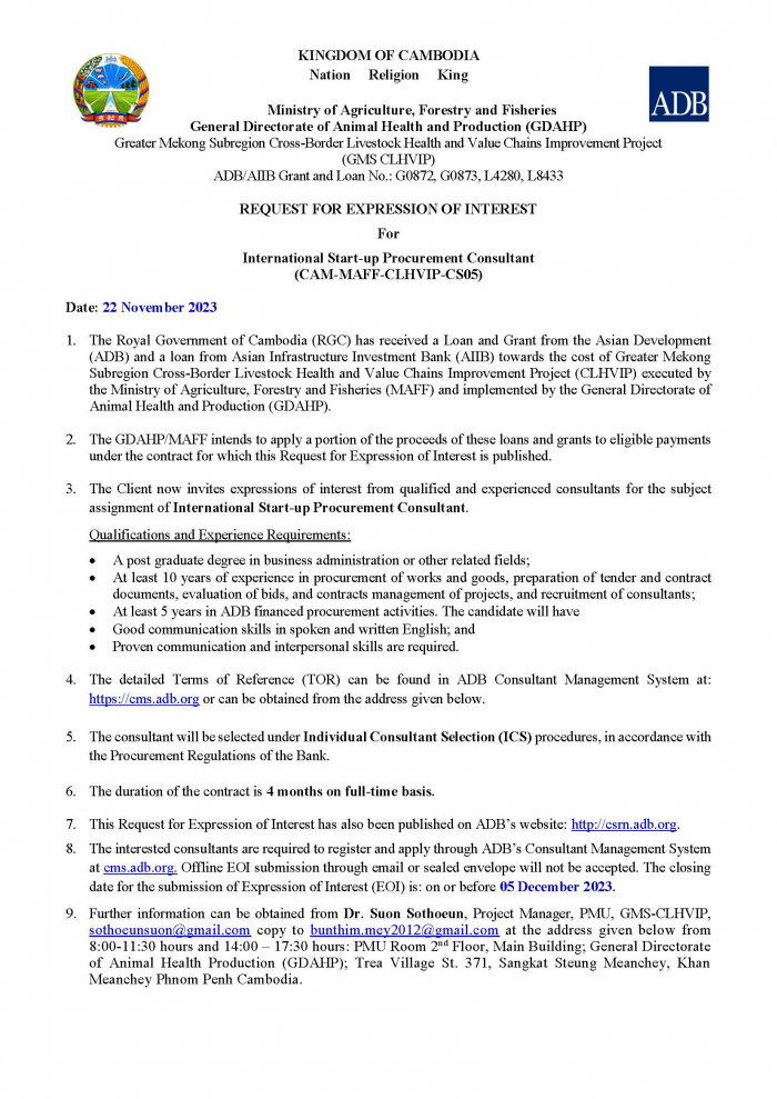 សេចក្តីជូនដំណឹង ស្តីពីការជ្រើសរើសទីប្រឹក្សាអន្តរជាតិផ្នែកលទ្ធកម្ម International Start-up Procurement Consultant (CAM-MAFF-CLHVIP-CS05)