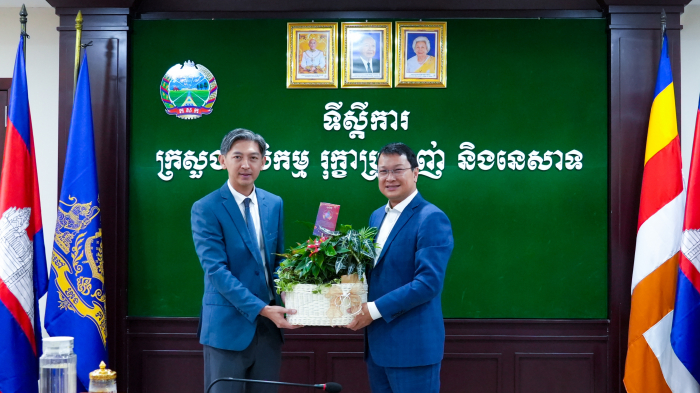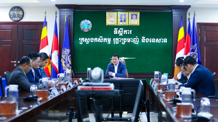 នាព្រឹកថ្ងៃទី២៣ ខែមេសា ឆ្នាំ២០២៥ ឯកឧត្តម ឌិត ទីណា រដ្ឋមន្ត្រីក្រសួងកសិកម្ម រុក្ខាប្រមាញ់ និងនេសាទ បានទទួលជួបជាមួយលោក លឹម ឃុនស្រ៊ុន អគ្គនាយកប្រតិបត្តិក្រុមហ៊ុន អប្សរា មេឌា សឺវីស ឯ.ក ក្នុងជំនួបសម្តែងការគួរសម និងពិភាក្សាការងារអំពីប្រព័ន្ធផ្សព្វផ្សាយ និងមាតិកាគាំទ្រដល់កិច្ចការងាររបស់ក្រសួង នៅទីស្តីការក្រសួងកសិកម្ម រុក្ខាប្រមាញ់ និងនេសាទ។