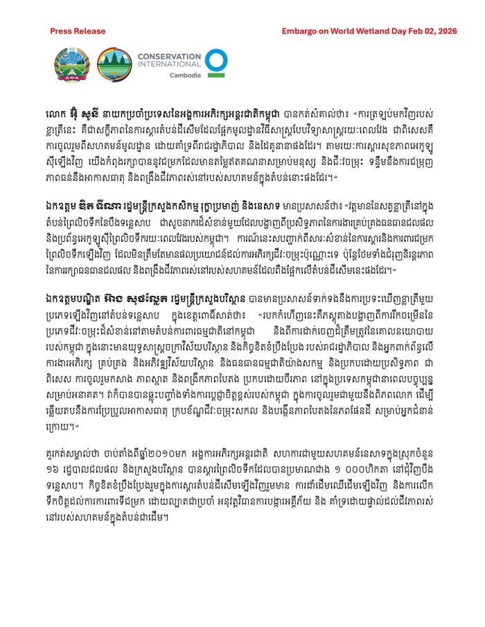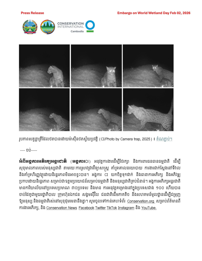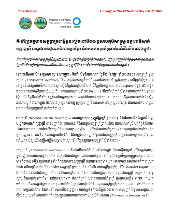 សេចក្តីប្រកាសព័ត៌មាន៖ គំហើញវត្តមានសត្វខ្លាត្រីជាថ្មីម្តងទៀតនៅបឹងទន្លេសាបភូមិសាស្ត្រខេត្តពោធិ៍សាត់ បង្ហាញពីលទ្ធផលវិជ្ជមានពីការស្តារព្រៃ និងការងារគ្រប់គ្រងតំបន់ដីសើមនៅកម្ពុជា