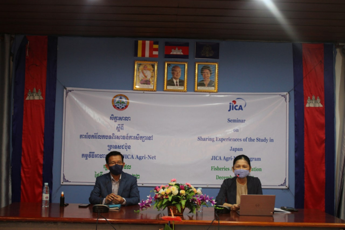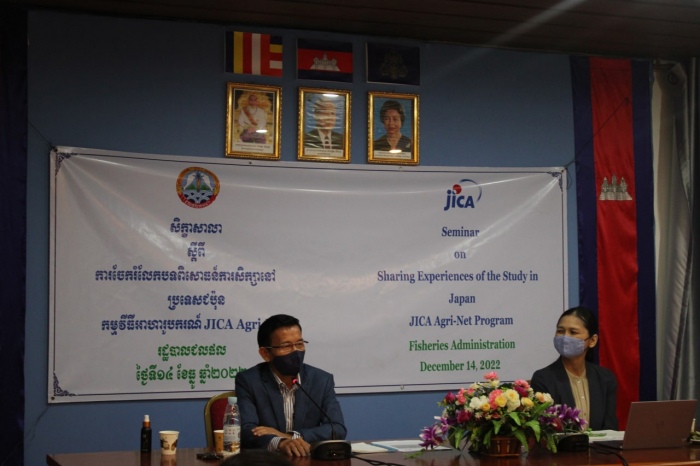 នៅរសៀលថ្ងៃទី១៤ ខែធ្នូ ឆ្នាំ២០២២ ត្រូវនឹងថ្ងៃពុធ ៦រោច ខែមិគសិរ ឆ្នាំខាល ចត្វាស័ក ព.ស.២៥៦៦ រដ្ឋបាលជលផលសហការជាមួយទីភ្នាក់ងារសហប្រតិបត្តិការអន្តរជាតិនៃប្រទេសជប៉ុន(JICA) បានរៀបចំកិច្ចប្រជុំចែករំលែកបទពិសោធន៍ការសិក្សានៅប្រទេសជប៉ុន ដែលផ្តល់ដោយកម្មវិធីអាហារូបករណ៍ JICA Agri-Net ក្រោមអធិបតីភាពលោកបណ្ឌិត ហាវ វិសិដ្ឋ អនុប្រធានរដ្ឋបាលជលផល និងលោកស្រី TOYAMA Haruko មន្ត្រីកម្មវិធីជាន់ខ្ពស់ កសិកម្ម និងឧត្តមសិក្សានៃអង្គការ JICA។ សិក្ខាសាលានេះមានសមាសភាពចូលរួមសរុបចំនួន៥៤នាក់ មកពីនាយកដ្ឋាន វិទ្យាស្ថាន និងមជ្ឈមណ្ឌល ក្រោមឱវាទរដ្ឋបាលជលផល សាកលវិទ្យាល័យភូមិន្ទកសិកម្ម និងវិទ្យាស្ថានជាតិកសិកម្មព្រែកលៀប។ គោលបំណងនៃសិក្ខាសាលាគឺចែករំលែកបទពិសោធន៍ការសិក្សា (រួមទាំងការស្រាវជ្រាវ និងការរស់នៅ) ក្នុងប្រទេសជប៉ុនរបស់អតីតនិស្សិតអាហារូបករណ៍ JICA Agri-Net ថ្នាក់បណ្ឌិត និងបរិញ្ញាបត្រជាន់ខ្ពស់កម្ពុជា (រដ្ឋបាលជលផល) និងផ្សព្វផ្សាយកម្មវិធីអាហារូបករណ៍ JICA Agri-Net ដល់អ្នកពាក់ព័ន្ធដែលចង់បន្តការសិក្សានៅប្រទេសជប៉ុន។