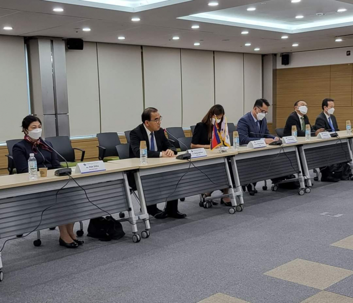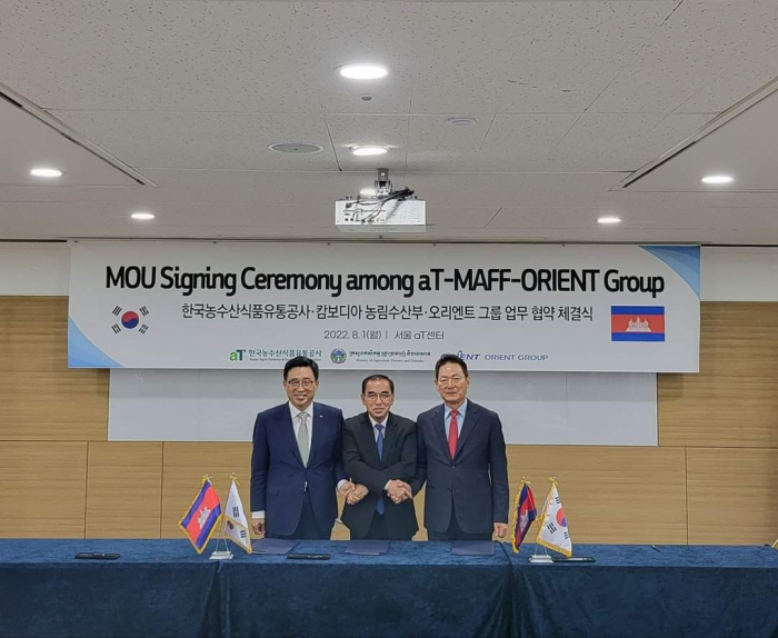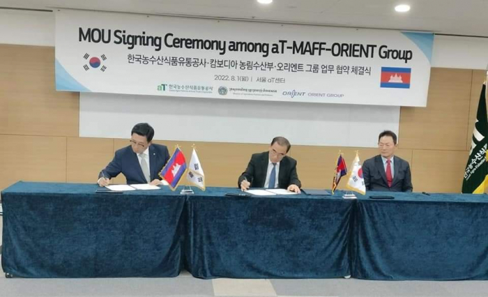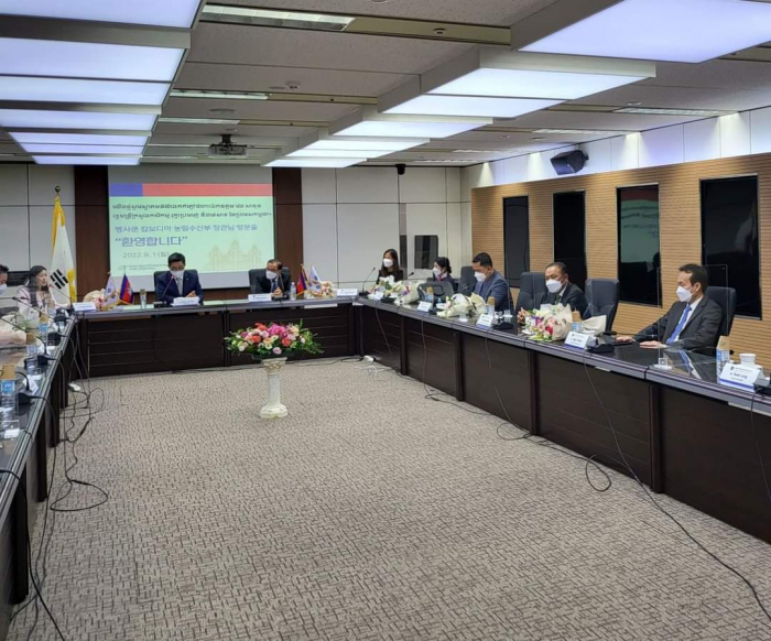 នៅរសៀលថ្ងៃដដែល ឯកឧត្តមរដ្ឋមន្ដ្រី និងសហការី បានអញ្ជើញមកពិនិត្យក្រុមហ៊ុន សាជីវកម្ម និងកសិ-ជលផល និងចំណីអាហារកូរ៉េ (Korea Agro-Fisheries & Food Trade Corporation, AT)។ ក្នុងជំនួបពិភាក្សា អគ្គនាយកប្រតិបត្តិក្រុមហ៊ុន Mr. Choon-Jin Kim មានមតិស្វាគមន៍គណ:ប្រតិភូកម្ពុជា ដឹកនាំដោយឯកឧត្តមរដ្ឋមន្ដ្រី ដែលបានអញ្ជើញមកបំពេញទស្សនកិច្ចនៅសាធារណរដ្ឋកូរ៉េ និងជាពិសេសមកធ្វើទស្សនកិច្ចនៅស្នាក់ការធំក្រុមហ៊ុន AT នារសៀលថ្ងៃនេះ។ ភាគីទាំងពីរបានពិភាក្សាគ្នាអំពីកិច្ចសហប្រតិបត្តិការលើការធ្វើកសិ-ពាណិជ្ជកម្មរវាងប្រទេសទាំងពីរសម្រាប់ថ្ងៃអនាគត។ ខ្លឹមសារនៃជំនួបពិភាក្សា ឯកឧត្តមរដ្ឋមន្ដ្រីបានជម្រាបជូន Mr. Choon-Jin Kim អំពីសក្តានុពលវិស័យកសិកម្មកម្ពុជា ដំណាំកសិ-ឧស្សាហកម្មសំខាន់ៗដែលអាចធ្វើ ការកែច្នៃ និងនាំចេញ។ ដំណើរទស្សនកិច្ចមកកាន់ក្រុមហ៊ុននារសៀលថ្ងៃនេះគឺដើម្បីបង្កើតកិច្ចសហការលើការងារកសិ-ពាណិជ្ជកម្ម រវាងប្រទេសទាំងពីរធ្វើយ៉ាងណាឲ្យកសិផលកម្ពុជាមានលទ្ធភាពនាំចូលមកសាធារណ:រដ្ឋកូរ៉េនាពេលអនាគត។ ឯកឧត្តមរដ្ឋមន្ដ្រីបន្តថា ពិតណាស់ការនាំចេញនឹងផ្តល់ឱកាសដល់ក្រុមហ៊ុនក្នុងស្រុក ក៏ដូចជាអ្នកផលិត មានឱកាសបង្កើនផលិតភាពផលិតកម្ម បង្កើនការកែច្នៃវត្ថុធាតុដើម និងបង្កើនតម្លៃបន្ថែម ហើយពិតជានឹងផ្តល់ប្រយោជន៍យ៉ាងច្រើនដល់ប្រទេស ក៏ដូចប្រជាកសិករកម្ពុជា តាមការរំពឹងទុករបស់រាជរដ្ឋាភិបាលកម្ពុជា។ ដូច្នេះ អនុស្សរណ:នៃការយោគយល់គ្នាដែលនឹងត្រូវចុះហត្ថលេខានៅរសៀលថ្ងៃនេះ នឹងដើរតួនាទីសម្របស្រួលដល់ការនាំចេញកសិផលកម្ពុជាមកកូរ៉េ និងផលិតផលកូរ៉េទៅកាន់កម្ពុជាវិញ។ សូមជម្រាបជូនថា ខ្លឹមសារសំខាន់នៃឯកសារកិច្ចព្រមព្រៀង MOU រវាងភាគីទាំងបីគឺ ÷ ក្រសួងកសិកម្ម រុក្ខាប្រមាញ់ និងនេសាទ ក្រុមហ៊ុន Orient Group និងក្រុមហ៊ុនសាជីវកម្ម និងកសិ-ជលផល និងចំណីអាហារកូរ៉េ មានដូចខាងក្រោម ÷ ១- ពង្រីកការផ្លាស់ប្តូរវប្បធម៌ម្ហូបអាហាររវាងកម្ពុជា និងកូរ៉េ និងជំរុញការធ្វើកសិ-ពាណិជ្ជកម្ម។ ២- ឲ្យតម្លៃលើការអនុវត្ត បរិស្ថាន សង្គម និងអភិបាលកិច្ច (Environment, Social and Gorvernan, ESG)។ ឧទាហរណ៍ Pursuing the low-carbon food lifestyle campaign "Global Green Food Day" ។ ៣- សហការគ្នារៀបចំពិពណ៌សាធារណ:អំពីវប្បធម៌ ឬក៏ប្រពៃណីម្ហូបអាហាររបស់ប្រទេសទាំងពីរ។ ៤- ផ្តល់ប្រឹក្សាយោបល់អំពីការចែកចាយផលិតផលកសិ-ជលផល និងការដឹក ជញ្ជូន។ ៥- ផ្តល់ប្រឹក្សាយោបល់អំពីថាត្រូវធ្វើយ៉ាងណាដើម្បីបង្កើនប្រាក់ចំណូលសម្រាប់កសិករ និងអ្នកនេសាទ។ ជំនួបត្រូវបានបញ្ចប់ក្នុងបរិយាកាសមិត្តភាព និងកិច្ចសប្រតិបត្តិគ្នាដើម្បីអភិវឌ្ឍវិស័យកសិកម្មកម្ពុជានាពេលអនាគត។ បន្ទាប់មកឯកឧត្តមរដ្ឋមន្រ្តី និងសហការីបានអញ្ជើញទៅពិនិត្យកន្លែងដេញថ្លៃលក់ផ្កា សួនផ្កាទៅតាមប្រភេទផ្កានីម