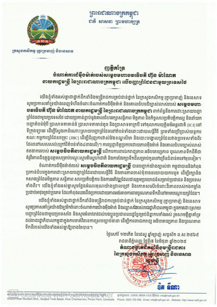 ញត្តិគាំទ្រចំណាត់ការដ៏ម៉ឺងម៉ាត់របស់ សម្តេចមហាបវរធិបតី ហ៊ុន ម៉ាណែត នាយករដ្ឋមន្ត្រីនៃព្រះរាជាណាចក្រកម្ពុជា លើបញ្ហាព្រំដែនជាមួយប្រទេសថៃ