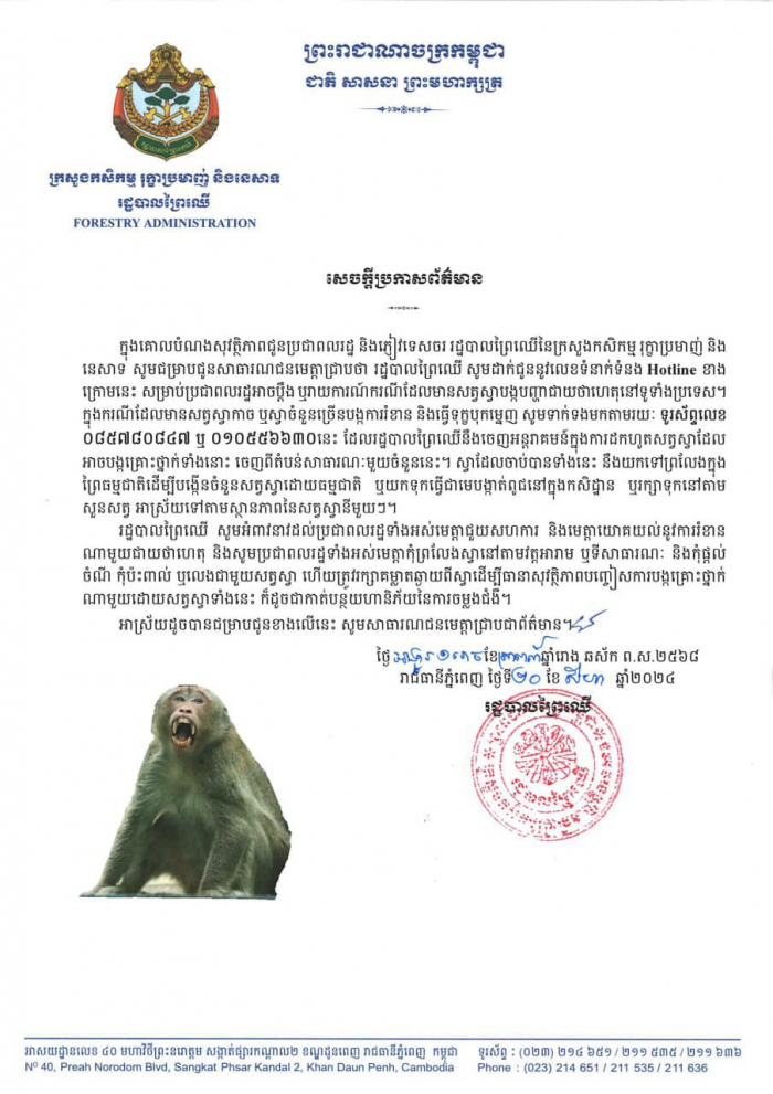 សេចក្តីប្រកាសព័ត៌មាន របស់រដ្ឋបាលព្រៃឈើ នៃក្រសួងកសិកម្ម រុក្ខាប្រមាញ់ និងនេសាទ ស្តីពីលេខទំនាក់ទំនង Hotline សម្រាប់ប្រជាពលរដ្ឋអាចប្តឹង ឬរាយការណ៍ករណីដែលមានសត្វស្វាបង្កបញ្ហាជាយថាហេតុទូទាំងប្រទេស៕