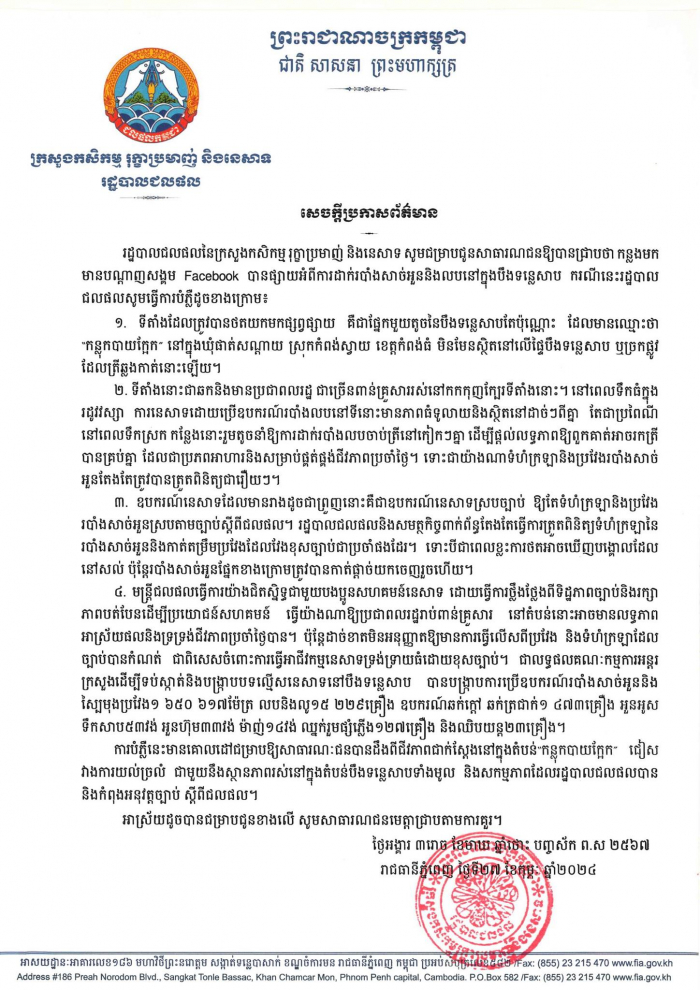 សេចក្ដីប្រកាសព័ត៌មានអំពីស្ថានភាពនេសាទនៅត្រង់ភូមិសាស្ត្រ​ «កន្លុកបាយក្អែក»​ ស្ថិតក្នុងឃុំផាត់សណ្ដាយ​​ ស្រុកកំពង់ស្វាយ ខេត្តកំពង់ធំ។