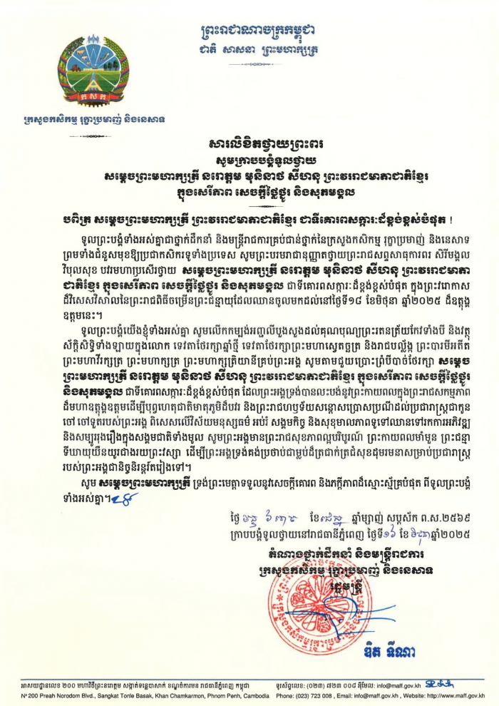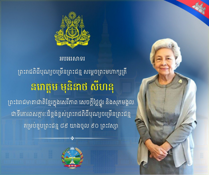 សម្តេចព្រះមហាក្សត្រី នរោត្តម មុនិនាថ សីហនុ ព្រះវររាជមាតាជាតិខ្មែរ ក្នុងសេរីភាព សេចក្តីថ្លៃថ្នូរ និងសុភមង្គល ជាទីគោរពសក្ការៈដ៏ខ្ពង់ខ្ពស់បំផុត ក្នុងព្រះវរោកាស ដ៏វិសេសវិសាលនៃព្រះរាជពិធីចម្រើនព្រះជន្មាយុដែលឈានចូលមកដល់នៅថ្ងៃទី១៨ ខែមិថុនា ឆ្នាំ២០២៥។