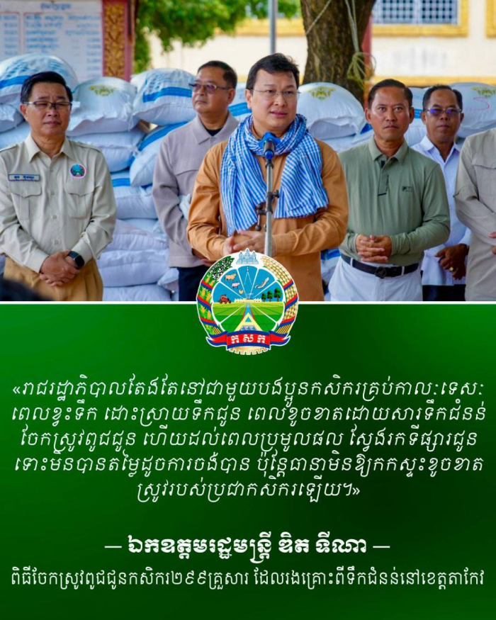 នាព្រឹកថ្ងៃទី០៨​ ខែវិច្ឆិកា​ ឆ្នាំ២០២៥​ ឯកឧត្តម​ ឌិត​ ទីណា​ រដ្ឋមន្រ្តីក្រសួងកសិកម្ម​ រុក្ខាប្រមាញ់​ និងនេសាទ​ អមដំណើរដោយឯកឧត្តម វ៉ី សំណាង អភិបាល នៃគណៈអភិបាលខេត្តតាកែវ និងសហការី បាននាំយកស្រូវពូជចំនួន ២៩,៩ តោន ក្រោមកម្មវិធីប្រព័ន្ធស្បៀងបម្រុងរបស់រាជរដ្ឋាភិបាល ដើម្បីចែកជូនពុកម៉ែបងប្អូនប្រជាកសិករចំនួន ២៩៩ គ្រួសារ ដែលរងផលប៉ះពាល់ពីទឹកជំនន់ជន់លិចដំណាំស្រូវនៅស្រុកទ្រាំង​ ខេត្តតាកែវ។