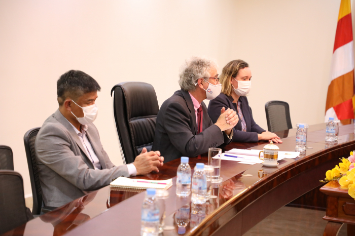 នៅរសៀលថ្ងៃពុធ ១៣រោច ខែផល្គុន ឆ្នាំឆ្លូវ ត្រីស័ក ពស២៥៦៥ ត្រូវនឹងថ្ងៃទី៣០ ខែមីនា ឆ្នាំ២០២២ ឯកឧត្តម វេង សាខុន រដ្ឋមន្រ្តី ក្រសួងកសិកម្ម រុក្ខាប្រមាញ់ និងនេសាទ បានទទួលជួបពិភាក្សាការងារជាមួយ លោក Yazid BENSAID នាយកទីភ្នាក់ងារអភិវឌ្ឍបារាំងប្រចាំតំបន់អាស៊ីអាគ្នេយ៍ នៅទីស្តីការក្រសួងកសិកម្ម រុក្ខាប្រមាញ់ និងនេសាទ។ គោលបំណងនៃកិច្ចជំនួបនេះ ដើម្បីពិនិត្យមើលពីវឌ្ឍនៈភាពនៃការងារអនុវត្តគម្រោងរវាងរាជរដ្ឋាភិបាលកម្ពុជា ជាមួយនឹង ទីភ្នាក់ងារអភិវឌ្ឍបារាំង និងពិភាក្សាពីសក្តានុពលក្នុងការសហការអនុវត្តគម្រោងនាពេលអនាគតបន្ថែមទៀត ជាពិសេសទិសដៅរបស់ក្រសួងកសិកម្ម រុក្ខាប្រមាញ់ និងនេសាទ ពាក់ព័ន្ធនឹងយុទ្ធសាស្រ្តឆ្លើយតបទៅនឹងការប្រែប្រួលអាកាសធាតុ។ ​​​​​​​​​​​​​​​​​​​​​​​​​​​​ ជាកិច្ចចាប់ផ្តើម ឯកឧត្តមរដ្ឋមន្រ្តី បានថ្លែងអំណរគុណចំពោះរដ្ឋាភិបាលបារាំង និងទីភ្នាក់ងារអភិវឌ្ឍបារាំងដែលបានជួយគាំទ្រដល់ការអភិវឌ្ឍន៍នៅក្នុងវិស័យនានានៅកម្ពុជា ជាពិសេសវិស័យកសិកម្ម។ ឯកឧត្តមរដ្ឋមន្រ្តី បានបន្ថែមថា វិស័យកសិកម្មនៅកម្ពុជានៅតែបន្តរក្សាកំណើនបានល្អ នៅរយៈពេលប៉ុន្មានឆ្នាំចុងក្រោយ ដោយមានការចូលរួមគាំទ្រពីដៃគូអភិវឌ្ឍជាច្រើន ក្នុងនោះទីភ្នាក់ងារអភិវឌ្ឍបារាំងជាដៃគូដ៏សំខាន់មួយ។ ឯកឧត្តមរដ្ឋមន្រ្តី បានបញ្ជាក់បន្ថែមថា បច្ចុប្បន្នក្រសួងកសិកម្ម រុក្ខាប្រមាញ់ និងនេសាទ កំពុងអនុវត្តគម្រោង និងកម្មវិធីចំនួនពីរ ក្រោមហិរញ្ញប្បទានឥណទានរបស់ទីភ្នាក់ងារអភិវឌ្ឍបារាំង សហការជាមួយដៃគូដទៃទៀតរួមមាន គម្រោងពង្រឹងសុវត្ថិភាព និងភាពប្រកួតប្រជែងក្នុងខ្សែច្រវាក់តម្លៃកសិកម្ម និង កម្មវិធីគ្រប់គ្រងធនធានទឹក និងការផ្លាស់ប្តូរនៃក្សេត្របរិស្ថាននៅកម្ពុជា ហើយគម្រោង និងកម្មវិធីទាំងពីរបាននិងកំពុងតែដំណើរការបានល្អ ហើយស្របទៅនឹងគោលនយោបាយរបស់រាជរដ្ឋាភិបាលក្នុងការជំរុញកំណើនជីវភាពកសិករ តាមរយៈការបង្កើនផលិតភាព ពិពិធកម្មកសិកម្ម ពាណិជ្ជូបនីយកម្មកសិកម្ម និងការបន្ស៊ាំទៅនឹងការប្រែប្រួលអាកាសធាតុ។​ ក្រៅពីនេះមន្រ្តីជំនាញរបស់ក្រសួង ក៏បាននឹងកំពុងសហការជាមួយជំនាញការដែលបានគាំទ្រដោយទីភ្នាក់ងារអភិវឌ្ឍបារាំងក្នុងការរៀបចំ និងសិក្សានូវគម្រោង និងកម្មវិធីថ្មី២ទៀត ដូចជា កម្មវិធីអភិវឌ្ឍបច្ចេកវិទ្យាកសិកម្មពឹងផ្អែកលើទឹកភ្លៀងនៅកម្ពុជា និងគម្រោងនិរន្តភាពនេសាទសមុទ្រ និងតំបន់ឆ្នេរ ដែលគម្រោង និងកម្មវិធីនេះត្រូវបានរំពឹងថានឹងចូលរួមជំរុញកំណើនសេដ្ឋកិច្ច តាមរយៈការបង្កើនតម្លៃបន្ថែមផលិតផលកសិកម្ម បង្កើនភាពធន់ទៅនឹងការប្រែប្រួលអាកាសធាតុដោយអនុវត្តនូវកសិកម្មវ័យឆ្លាតនិងកសិកម្មអភិរក្ស ប
