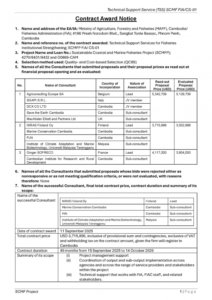 សង្ខេបការវាយតម្លៃ និងប្រគល់កិច្ចសន្យា នៃកញ្ចប់ទីប្រឹក្សាសេវាគាំទ្របច្ចេកទេស សម្រាប់ការពង្រឹងស្ថាប័នជលផល (Technical Support Service for Fisheries Institutional Strengthening) SCMFP FIA/CS-01 របស់គម្រោងជលផលសមុទ្រ និងតំបន់ឆ្នេរ (SCMF)។