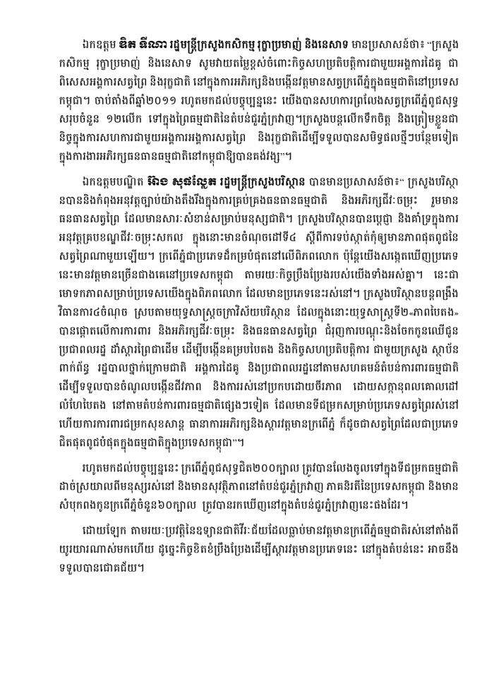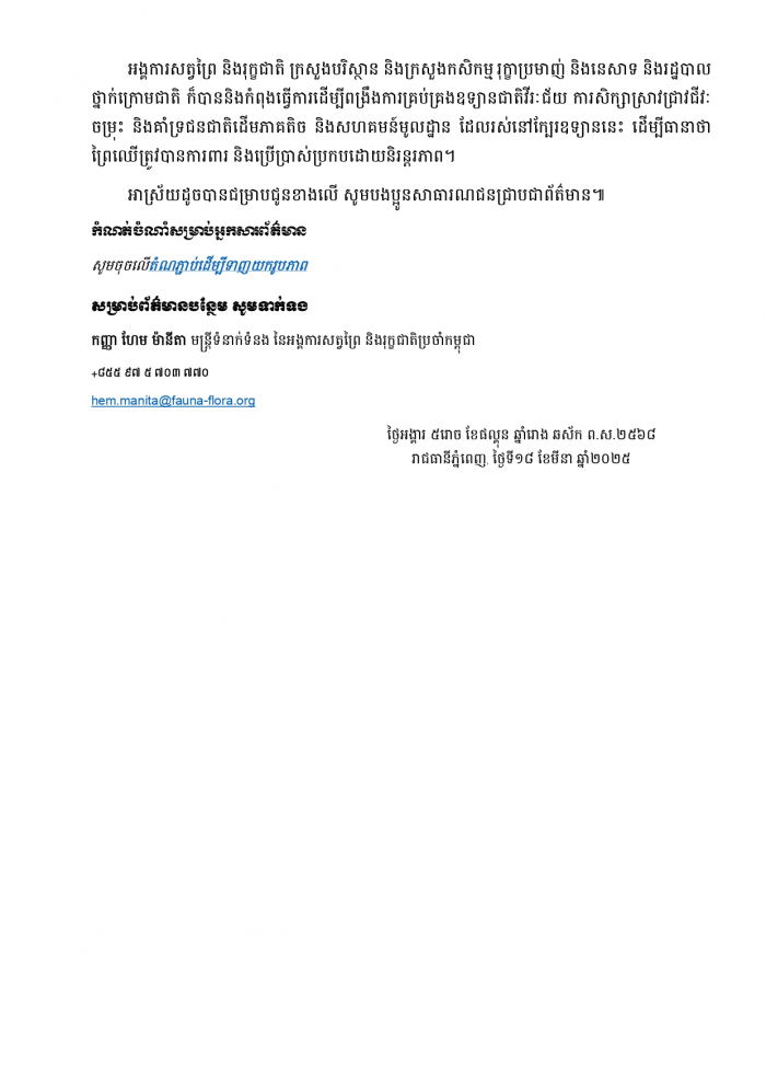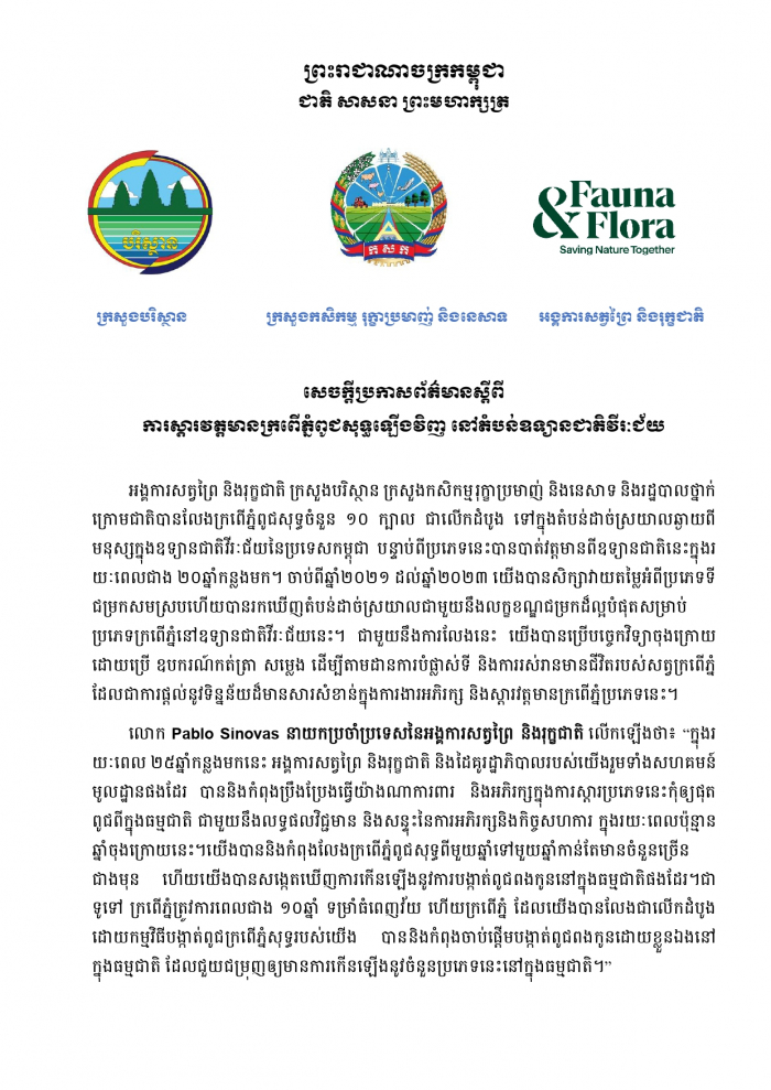 សេចក្តីប្រកាសព័ត៌មានស្តីពី ការស្តារវត្តមានក្រពើភ្នំពូជសុទ្ធឡើងវិញ នៅតំបន់ឧទ្យានជាតិវីរៈជ័យ