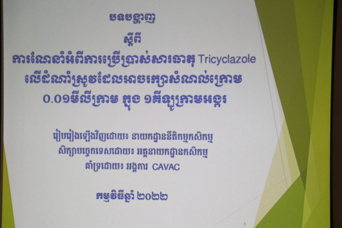 អង្គសិក្ខាសាលាផ្សព្វផ្សាយស្តីពីការអនុញ្ញាតឲ្យប្រើប្រាស់ថ្នាំកសិកម្ម Tricyclazole ឡើងវិញ និងការណែនាំពីរបៀបប្រើប្រាស់ នៅខេត្តស្ទឹងត្រែង ។