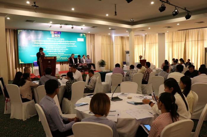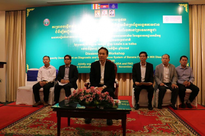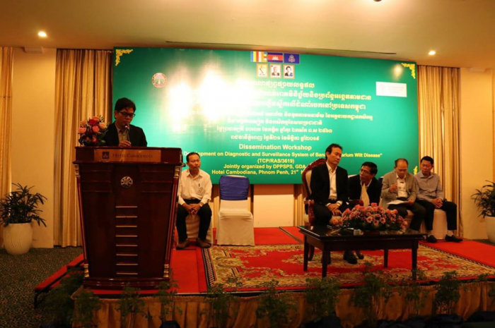 កាលពីព្រឹកថ្ងៃព្រហស្បតិ៍ ១០រោច ខែកត្តិក ឆ្នាំកុរ ឯកស័ក ព.ស.២៥៦៣ ត្រូវនឹងថ្ងៃទី២១ ខែវិច្ឆិកា ឆ្នាំ២០១៩ នៅសណ្ឋាគារកាំបូឌីយ៉ាណា រាជធានីភ្នំពេញ នាយកដ្ឋានការពារដំណាំ អនាម័យ និងភូតគាមអនាម័យ នៃអគ្គនាយកដ្ឋានកសិកម្ម ក្រោមកិច្ចសហការជាមួយអង្គការស្បៀង និងកសិកម្មសហប្រជាជាតិ(FAO) ប្រចាំព្រះរាជាណាចក្រកម្ពុជា បានរៀបចំសិក្ខាសាលាផ្សព្វផ្សាយលទ្ធផលគម្រោងបង្កើនសមត្ថភាពលើការកំណត់រោគវិនិច្ឆ័យនិងប្រព័ន្ធអង្កេតតាមដានជំងឺផ្សិតហ៊្វុយសារីយ៉ូមស្រពោនលឿងស្លឹកលើដំណាំចេកនៅប្រទេសកម្ពុជាក្រោមអធិបតីភាពដ៏ខ្ពង់ខ្ពស់របស់ ឯកឧត្តមបណ្ឌិត ងិន ឆាយ ប្រតិភូរាជរដ្ឋាភិបាលកម្ពុជាទទួលបន្ទុក ជាអគ្គនាយកនៃអគ្គនាយកដ្ឋានកសិកម្ម ដោយមានការអញ្ជើញចូលរួមពីថ្នាក់ដឹកនាំនិងមន្រ្តីរាជការនៃនាយកដ្ឋានការពារដំណាំ អនាម័យ និងភូតគាមអនាម័យ មន្រ្តីនៃនាយកដ្ឋានដំណាំឧស្សាហកម្ម មន្ទីរកសិកម្ម រុក្ខាប្រមាញ់ និងនេសាទខេត្តកំពង់ចាម រតនគីរី សៀមរាប បាត់ដំបង ក្រចេះ ពោធិ៍សាត់ មណ្ឌលគីរី កំពត កណ្ដាល និងខេត្តត្បូងឃ្មុំ សាកលវិទ្យាល័យភូមិន្ទកសិកម្ម វិទ្យាស្ថានស្រាវជ្រាវ និងអភិវឌ្ឍន៍កសិកម្មកម្ពុជា កសិករ តំណាងអង្គការសេដាក តំណាងអង្គការFAO និងតំណាងក្រុមហ៊ុនដាំដំណាំចេកអំបូងលឿង សរុបចំនួន ៤១រូប។