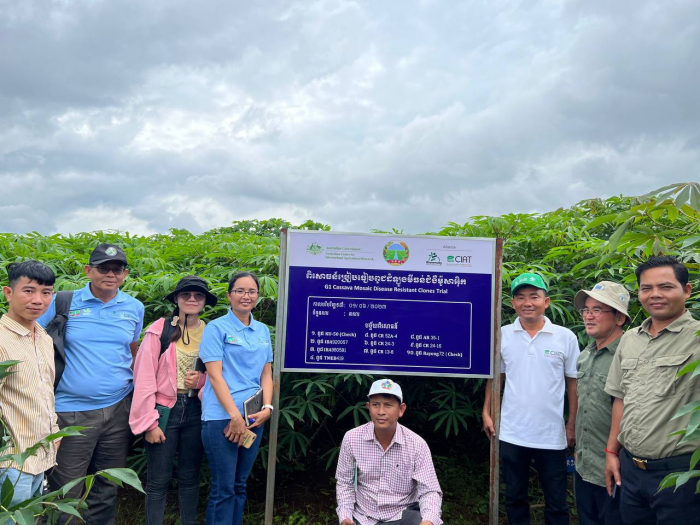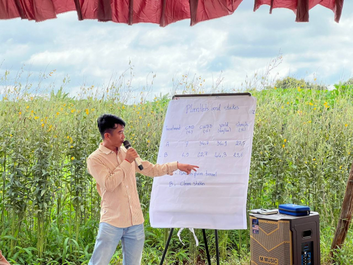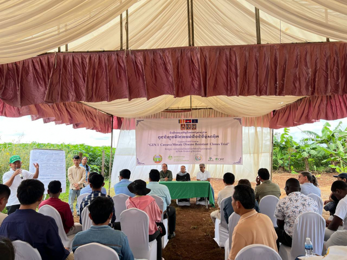 ថ្ងៃចន្ទ ៣រោច ខែភទ្របទ ឆ្នាំឆ្លូវ បញ្ចស័ក ព.ស២៥៦៧ ត្រូវនឹងថ្ងៃទី០២ ខែតុលា ឆ្នាំ២០២៣ នាយកដ្ឋានដំណាំឧស្សាហកម្មនៃអគ្គនាយកដ្ឋានកសិកម្ម សហការជាមួយអង្គការ CIAT បានរៀបចំទស្សនកិច្ចសិក្សាអំពីការពិសោធន៍ពូជដំឡូងមីធន់ទ្រាំនឹងជំងឺម៉ូសាអ៊ិច (CMD) នៅកសិដ្ឋានផលិតពូជដំណាំតំបន់ដីខ្ពស់ចម្ការលើ ក្រោមអតិបតីភាពលោកបណ្ឌិត នី វុទ្ធី អគ្គនាយករង និងជាតំណាងដ៏ខ្ពង់ខ្ពស់របស់ឯកឧត្តមប្រតិភូរាជរដ្ឋាភិបាលទទួលបន្ទុកជាអគ្គនាយក នៃអគ្គនាយកដ្ឋានកសិកម្ម។ កម្មវិធីនេះមានអ្នកចូលរួមសរុបចំនួន ៦៥រូប ដែលអញ្ជើញមកពីនាយកដ្ឋានដំណាំឧស្សាហកម្ម នាយកដ្ឋានការពារដំណាំ អនាម័យ និងភូតគាមអនាម័យ និងនាយកដ្ឋានពូជដំណាំនៃអគ្គនាយកដ្ឋានកសិកម្ម វិទ្យាស្ថានស្រាវជ្រាវនិងអភិវឌ្ឍន៌កសិកម្មកម្ពុជា មន្ទីរកសិកម្ម រុក្ខាប្រមាញ់ និងនេសាទខេត្តត្បូងឃ្មុំ បន្ទាយមានជ័យ បាត់ដំបង ស្ទឹងត្រែង ឧត្តរមានជ័យ និងព្រះវិហារ កសិករដាំដំឡូងមី សមាគមកសិករដំឡូងមី អង្គការ ACIAR, CIAT,GIZ និងអ្នកជំនាញការផ្នែកដំណាំដំឡូងមីនៃសាកលវិទ្យាល័យកាសេសាទប្រទេសថៃ ឡាវ វៀតណាម និងយូហ្កានដា (Uganda)។ គោលបំណងនៃទស្សនកិច្ចសិក្សាខាងលើ ដើម្បីបង្ហាញលទ្ធផលគម្រោងដែលបានអនុវត្តកន្លងមក ដោយធ្វើការវាយតម្លៃការលូតលាស់និងភាពធន់ទ្រាំនឹងជំងឺម៉ូសាអ៊ិច របស់ពូជដំឡូងមីដែលបានកំពុងធ្វើពិសោធន៍៕