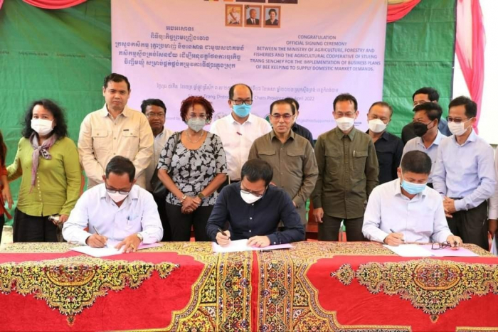 ឯកឧត្តមរដ្ឋមន្ត្រី បានថ្លែងអំណរគុណចំពោះវត្តមានលោកស្រីនាយិកា និងសហការី និងបានសម្តែងនូវបីតិសោមនស្ស និងចូលរួមអបអរ ដោយបានចូលរួមក្នុងពិធីចុះកិច្ចព្រមព្រៀងហិរញ្ញ ប្បទានឥតសំណងបំពេញបន្ថែមទុនវិនិយោគនាពេលនេះ។ លោកបានវាយតម្លៃខ្ពស់ចំពោះអង្គភាពសម្របសម្រួលគម្រោងពិពិធកម្មកសិកម្មកម្ពុជា ដែលបានសហការល្អជាមួយក្រសួង-ស្ថាប័នពាក់ព័ន្ធ និងអ្នកផ្តល់សេវាបច្ចេកទេសដែលបានរៀបចំពិធីនេះឡើង ហើយឯកឧត្តមរដ្ឋមន្រ្តីសង្ឃឹមថាតាមរយៈការគាំទ្រមូលនិធិរបស់ធនាគារពិភពលោក ប្រាកដជានឹងរួមចំណែកលើកកម្ពស់ការអភិវឌ្ឍសហគមន៍កសិកម្ម និងភាពជាដៃគូប្រកបដោយផ្លែផ្កានៅក្នុងខ្សែច្រវាក់តម្លៃផលិតកម្មកសិកម្ម ស្របតាមអភិក្រម “រដ្ឋ-ឯកជន ដៃគូអភិវឌ្ឍន៍ និងសហគមន៍” និងជា ពិសេសសហគមន៍ស្ទឹងត្រង់សែនជ័យនឹងមានការរីកចម្រើនថែមទៀតតាមរយ:ការពង្រីកផលិតកម្មចិញ្ចឹមឃ្មុំ និងផលិតជីសរីរាង្គ។