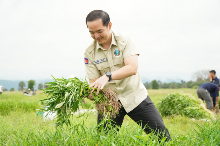 នាព្រឹកថ្ងៃទី២២ ខែសីហា ឆ្នាំ២០២៥ ឯកឧត្តម សៀក ឡេង អនុរដ្ឋលេខាធិការ និងជាតំណាងដ៏ខ្ពង់ខ្ពស់ ឯកឧត្តម ឌិត ទីណា រដ្ឋមន្ត្រីក្រសួងកសិកម្ម រុក្ខាប្រមាញ់ និងនេសាទ បានអញ្ជេីញជួបសំណេះសំណាល និងនាំយកអំណោយជាស្បៀងជូនដល់កងទ័ពជួរមុខដែលកំពុងឈរជើងការពារបូរណភាពទឹកដីតាមបន្ទាត់ព្រំដែនកម្ពុជា-ថៃ ក្នុងភូមិសាស្ត្រខេត្តឧត្តរមានជ័យ នៅមន្ទីរកសិកម្ម រុក្ខាប្រមាញ់ និងនេសាទខេត្តឧត្តរមានជ័យ។