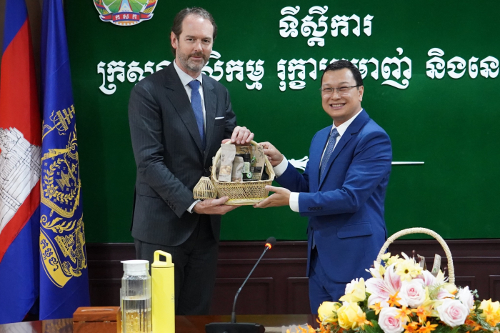នៅរសៀលថ្ងៃទី១៩ ខែមេសា ឆ្នាំ២០២៣ ឯកឧត្តម ឌិត ទីណា រដ្ឋមន្ត្រីក្រសួងកសិកម្ម រុក្ខាប្រមាញ់ និងនេសាទ និងថ្នាក់ដឹកនាំ បានទទួលជួបសម្តែងការគួរសម និងពិភាក្សាការងារជាមួយលោក Bertrand Ambroise ប្រធាននាយកដ្ឋានទំនាក់ទំនងអន្តរជាតិនៃផ្សារអន្តរជាតិ Rungis នៅទីស្តីការក្រសួងកសិកម្ម រុក្ខាប្រមាញ់ និងនេសាទ។