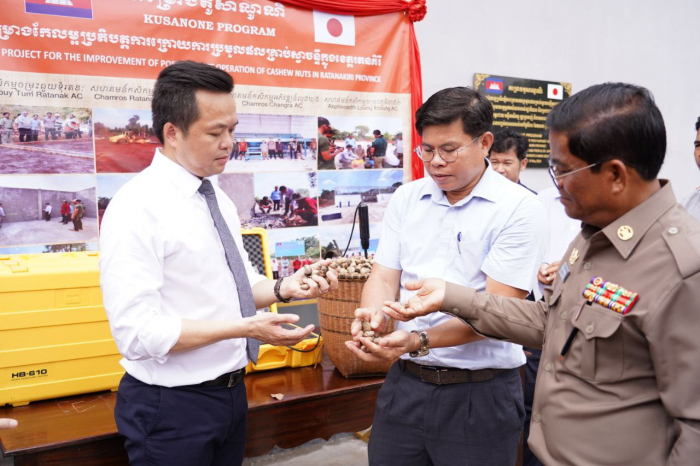 ឃ្លាំងស្តុកទុក រានហាល ម៉ាស៊ីនជ្រើសរើសគុណភាពគ្រាប់ និងម៉ាស៊ីនវាស់សំណើមគ្រាប់ស្វាយចន្ទី ទទួលបានពីគម្រោងគូសាណូណិ ដែលជាជំនួយឥតសំណងពីស្ថានទូតជប៉ុន ក្នុងគម្រោងកែលម្អប្រតិបត្តិការក្រោយការប្រមូលផលគ្រាប់ស្វាយចន្ទី។