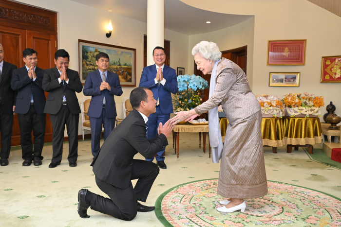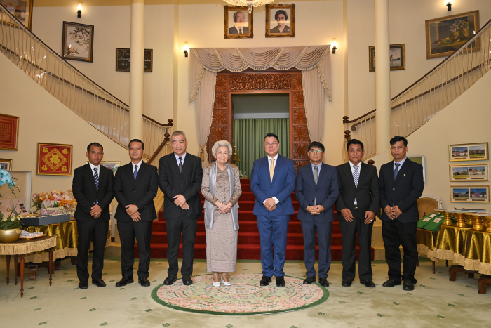 សម្តេចព្រះមហាក្សត្រី នរោត្តម មុនិនាថ សីហនុ ព្រះវររាជមាតាជាតិខ្មែរ ជាទីសក្ការៈដ៏ខ្ពង់ខ្ពស់បំផុត ព្រះអង្គសព្វព្រះរាជហឬទ័យប្រោសព្រះរាជទានឯកឧត្តម ឌិត ទីណា រដ្ឋមន្ត្រីក្រសួងកសិកម្ម រុក្ខាប្រមាញ់ និងនេសាទ ព្រមទាំងប្រតិភូអមដំណេីរ ចូលក្រាបថ្វាយបង្គំគាល់ នៅព្រះរាជដំណាក់គន្ធបុប្ផាក្នុងព្រះបរមរាជវាំង