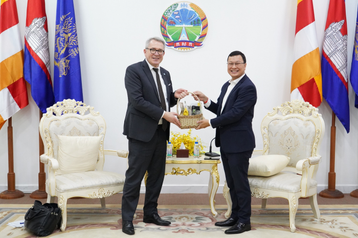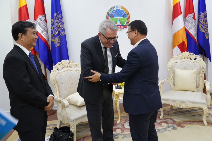 នៅព្រឹកថ្ងៃទី២៧ ខែមេសា ឆ្នាំ២០២៣ ឯកឧត្តម ឌិត ទីណា រដ្ឋមន្ត្រីក្រសួងកសិកម្ម រុក្ខាប្រមាញ់ និងនេសាទ និងថ្នាក់ដឹកនាំ បានចូលរួមប្រជុំពិភាក្សាជាមួយលោក Gunther Beger នាយកគ្រប់គ្រង SDG ការច្នៃប្រឌិត និងការផ្លាស់ប្តូរសេដ្ឋកិច្ច នៃអង្គការសហប្រជាជាតិដើម្បីអភិវឌ្ឍន៍ឧស្សាហកម្ម (UNIDO) នៅទីស្តីការក្រសួងកសិកម្ម រុក្ខាប្រមាញ់ និងនេសាទ។
