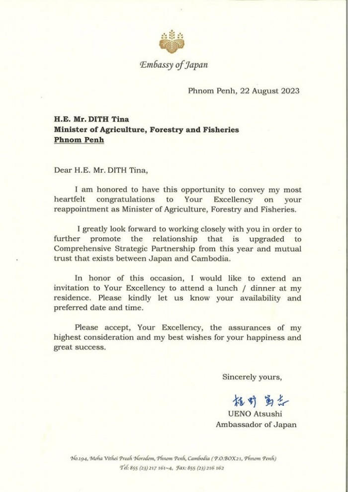 ឯកអគ្គរាជទូតជប៉ុនប្រចាំកម្ពុជា គោរពជូន ឯកឧត្តម ឌិត ទីណា រដ្ឋមន្ត្រីក្រសួងកសិកម្ម រុក្ខាប្រមាញ់ និងនេសាទ