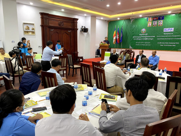 ថ្ងៃទី១៩-២០ ខែតុលា ឆ្នាំ២០២៣ នៅសណ្ឋាគារអាស៊ាន ខេត្តកំពង់ចាម មានការរៀបចំសិក្ខាសាលាស្តីពីស្ថានភាពបច្ចុប្បន្ន និងទស្សនវិស័យអនាគតនៃការអភិវឌ្ឍពូជពោតអ៊ីប្រ៊ីដនៅកម្ពុជា ដែលរៀបចំដោយក្រុមការងារគម្រោងផលិតកម្ម និងប្រព័ន្ធផ្សព្វផ្សាយគ្រាប់ពូជពោតនៅកម្ពុជា ក្រោមអធិបតីភាព ឯកឧត្ដម ឈុំ ឆុនលី អនុរដ្ឋលេខាធិការក្រសួងកសិកម្ម រុក្ខាប្រមាញ់ និងនេសាទ លោកបណ្ឌិត យិន ច័ន្ទសុធី អគ្គនាយករងនៃអគ្គនាយកដ្ឋានកសិកម្ម និងជាតំណាងដ៏ខ្ពង់ខ្ពស់របស់ឯកឧត្ដមបណ្ឌិត ងិន ឆាយ ប្រតិភូរាជរដ្ឋាភិបាលកម្ពុជាទទួលបន្ទុកជាអគ្គនាយកនៃអគ្គនាយកដ្ឋានកសិកម្ម លោក ធីវ វណ្ណធីរ ប្រធាននាយកដ្ឋានដំណាំឧស្សាហកម្ម និងមានការអញ្ជើញចូលរួមពីថ្នាក់ដឹកនាំ និងមន្រ្តីរាជការនៃអគ្គនាយកដ្ឋានកសិកម្ម ក្រុមការងារគម្រោង KOPIA-KOREA ប្រចាំនៅកម្ពុជា មន្ទីរកសិកម្ម រុក្ខាប្រមាញ់ និងនេសាទខេត្តកំពង់ចាម ត្បូងឃ្មុំ បាត់ដំបង ប៉ៃលិន ខេត្តកណ្ដាល វិទ្យាស្ថានស្រាវជ្រាវនិងអភិវឌ្ឍន៍កសិកម្មកម្ពុជា ក្រុមហ៊ុនCP Cambodia Co.Ltd, East-West Seed Company ព្រមទាំងកសិករចូលរួមសរុប ៧៤នាក់ ក្នុងនោះមានស្រ្តី១៣នាក់។ កម្មវិធីសិក្ខាសាលានេះរៀបចំឡើងក្នុងគោលបំណង៖
