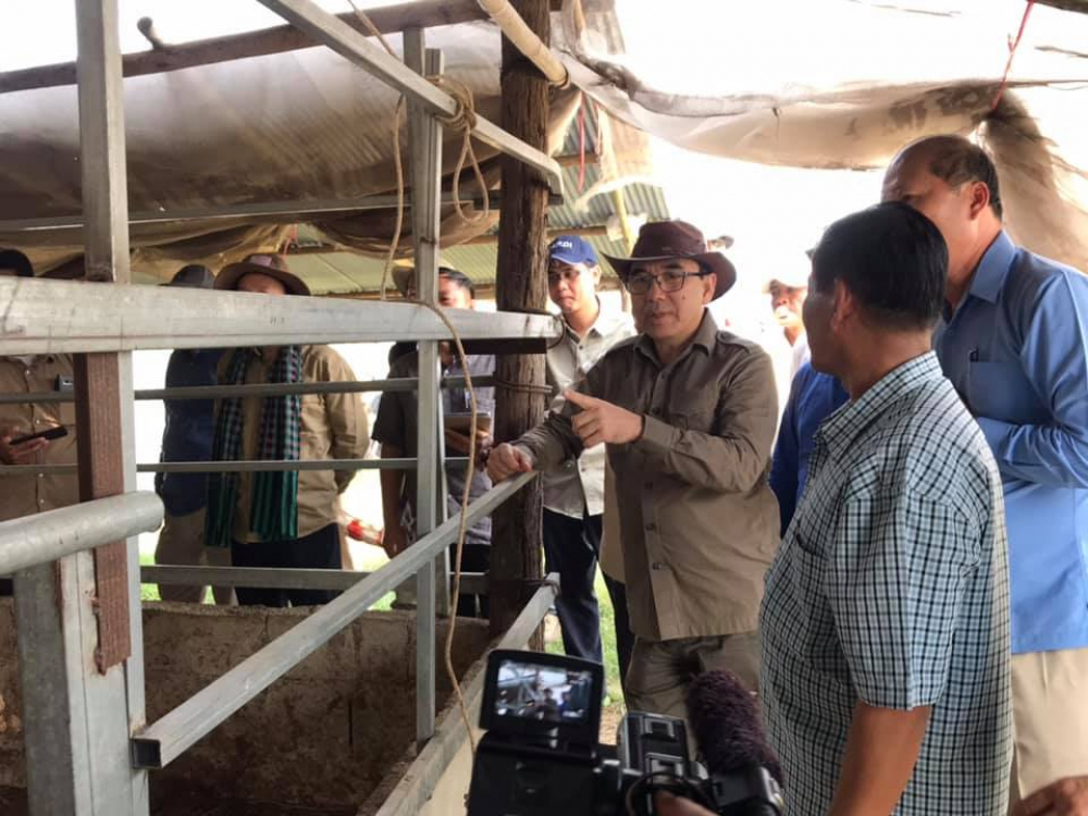 នារសៀលថ្ងៃសៅរ៍ ១៣រោច ខែបុស្ស ឆ្នាំច សំរឹទ្ធិស័ក ព.ស ២៥៦២ ត្រូវនឹងថ្ងៃទី០២ ខែកុម្ភៈ ឆ្នាំ ២០១៩ ឯកឧត្តម វេង សាខុន រដ្ឋមន្រ្តីក្រសួងកសិកម្ម រុក្ខាប្រមាញ់ និងនេសាទ និងលោកជំទាវ បានអញ្ជើញបន្តចុះពិនិត្យកសិដ្ឋានចិញ្ចឹមគោរបស់លោក ហ៊ាង រដ្ឋា ក្នុងភូមិកំពង់ជ្រៃ ឃុំស្មោង ស្រុកទ្រាំង ខេត្តតាកែវ។